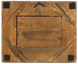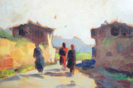 Scorcio di paese con contadine, olio su tavoletta, cm 12,5x19, entro cornice