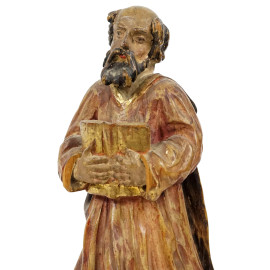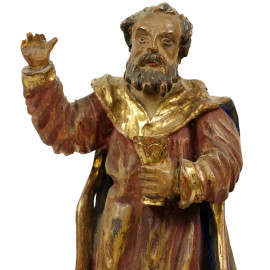 Due antiche sculture in legno policromo raffiguranti santi, h max cm 33,5, (difetti)