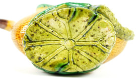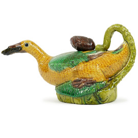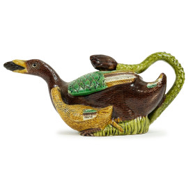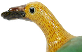 Due recipienti in porcellana policroma a forma di anatre, Cina, XX secolo, cm 10x18x7,5, (difetti)