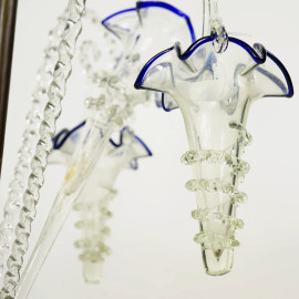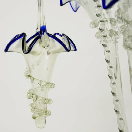 Epergne vittoriana in vetro con profili blu, calice centrale circondato da sei contenitori, base a forma di ciotola smerlata, Inghilterra, 1880 circa, altezza cm 62
