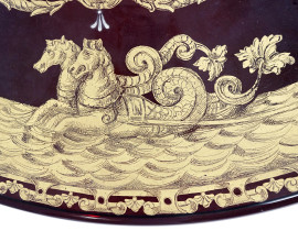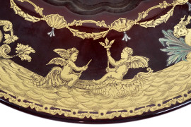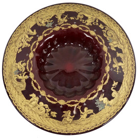 Grande centrotavola in vetro soffiato di Murano color rosso rubino, con decorazioni dorate raffiguranti putti, XX secolo, diametro cm 56
