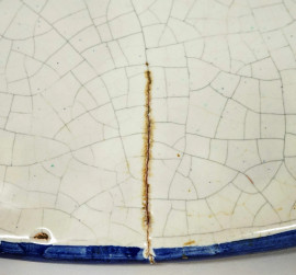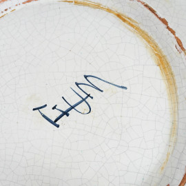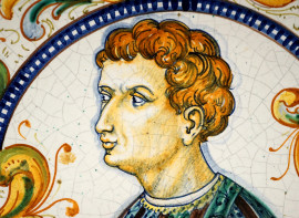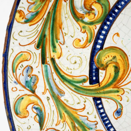 Grande piatto in maiolica policroma in stile rinascimentale raffigurante una figura maschile, fascia decorata a motivi vegetali, XX secolo, diametro cm 43,5