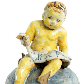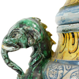 corpo a balaustro decorato da grande riserva centrale raffigurante Ercole e il toro di Creta, sorretto da quattro arpie alate su base circolare; coperchio a cupola con presa a foggia di putto con cartiglio, anse a forma di animale fantastico con proboscide che sostiene, con l'aiuto di due tritoni, uno scudo araldico quadripartito.