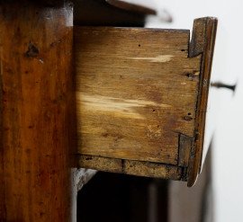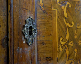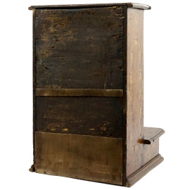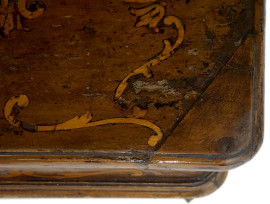 Inginocchiatoio del XVIII secolo, in legno intarsiato in varie essenze, basamento aggettante con vano a ribalta, cm h 80x47,5x52 (difetti e restauri)