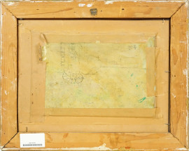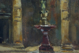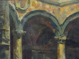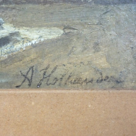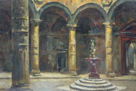 Interno di chiostro, olio su cartone, firmato in basso a destra A. Hollaender, cm 18,7x28,3, entro cornice