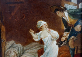 La visita dell'amante, da Pierre-Antoine Baudouin, miniatura, firmata, cm 8,5x7 circa, entro cornice