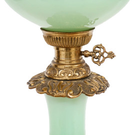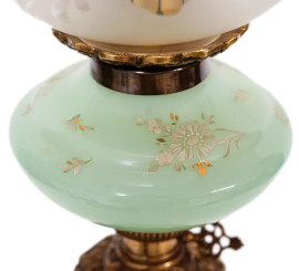 Lampada da tavolo in vetro opalino verde con decori floreali dipinti a mano, montatura in metallo dorato, paralume in vetro satinato, prima metà del XX secolo, cm h 64