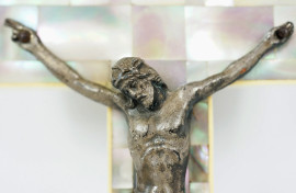 Lotto composto da 2 binocoli da teatro ed un crocifisso in metallo dorato, misura max cm 18x9