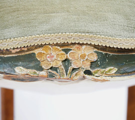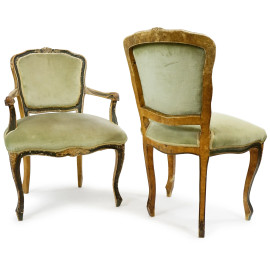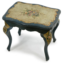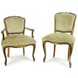 Lotto composto da 2 poltroncine del XX secolo in legno laccato, intagliato e dorato con schienale e seduta imbottiti, misura max cm h 89x50x35, e un tavolinetto in legno laccato con decorazioni floreali, XX secolo, cm h 38,5x47x37