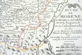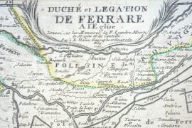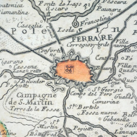 Lotto composto da 2 stampe raffiguranti la carta geografica del ducato di Ferrara e di Modena, XVIII secolo, cm 33,5x38, entro cornice
