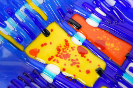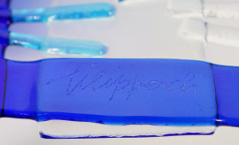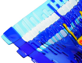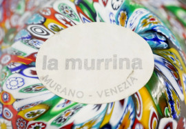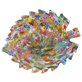 Lotto composto da un centrotavola in vetro di Gino Filippeschi e un centrino in vetro di murano con murrina millefiori a forma di foglia, misura max 25,5x27,5