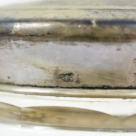 Lotto composto da una bottiglia e due contenitori in cristallo sfaccettato con coperchi in argento 800, inizi XX secolo, h max cm 12,5, (difetti)