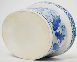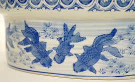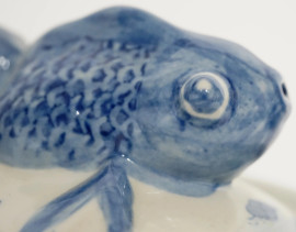 Lotto di 2 portavivande in ceramica bianca e blu, coperchi con prese a foggia di pesci, arte orientale, XX secolo, altezza cm 15