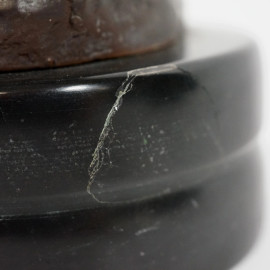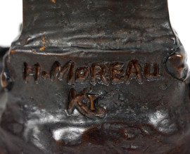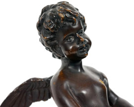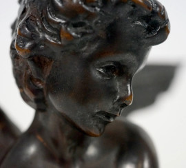 Lotto di due sculture in bronzo patinato raffiguranti un putto che suona un tamburo e Cupido, base circolare in marmo, da Hippolyte Moreau (1832 – 1927), altezza max cm 27,5 (difetti)