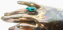 Lotto di due spille vintage a forma di mano, in metallo argentato e dorato con strass multicolore, misure max cm 8,5x3, (difetti)