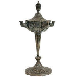 base circolare con decorazione perimetrale a perline, fusto scanalato che sorregge la vasca porta olio a tre bocche con i medesimi decori della base, coperchio con presa a forma di vaso ad urna. Completa di ventola paraluce di forma rettangolare in stoffa verde.