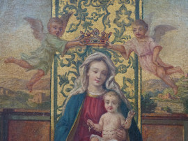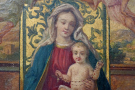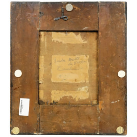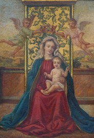 Madonna in trono con il Bambino e due angeli, fine XIX secolo, olio su tavoletta, cm 24,5x20, entro cornice