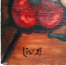 Maestro del Novecento, Natura morta con ortaggi, 1957, olio su tavola, cm 40x50, firmato e datato