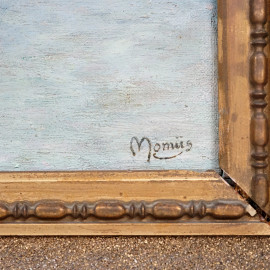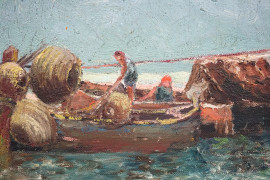 Marina con barche, olio su tela, firmato in basso a destra Momüs, cm 29,5x45,8, entro cornice