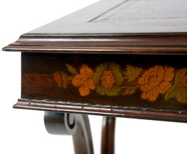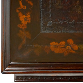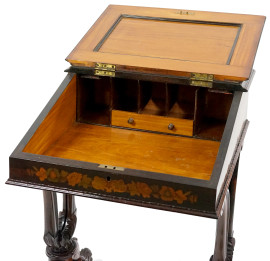 Mobile scrittoio in legno intarsiato in varie essenze, prima metà del XIX secolo, piano apribile con inserto in pelle, montanti mossi poggianti su quattro piedi scolpiti raccordati da traversa tornita, cm h 82x54,5x54,5, (difetti, restauri)