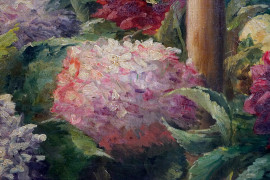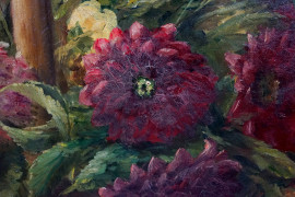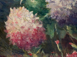 Natura morta con cesta di fiori, olio su tela, fine XIX secolo, firmato in alto a sinistra, cm 73,5x100 (entro cornice)