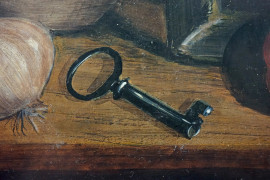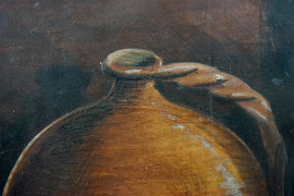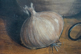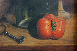 Natura morta, dipinto su pergamena, cm 13,5x12,5, entro cornice