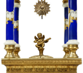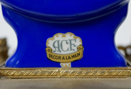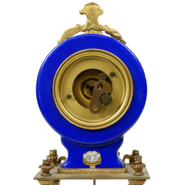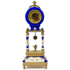 Orologio da tavolo in bronzo e porcellana blu e bianca con finiture dorate, XX secolo, altezza cm 33