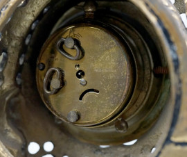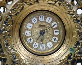 Orologio da tavolo in bronzo, Goldbuhl, XX secolo, quadrante a numeri romani, altezza cm 45,5, (da revisionare)