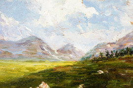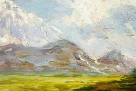 Paesaggio di montagna, olio su compensato, XX secolo, cm 7,5x13 circa, entro cornice