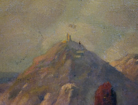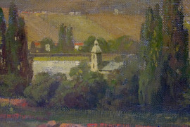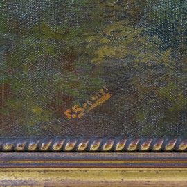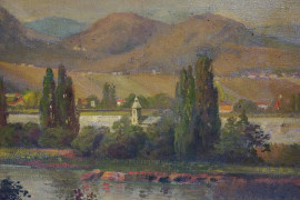 Paesaggio fluviale con case e montagne, olio su tela, firmato, cm 34x52,5, entro cornice