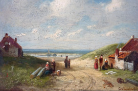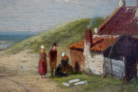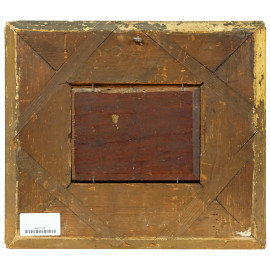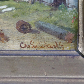 Paesaggio rurale con figure, olio su tavola, firmato in basso a destra, cm 13,2x18, entro cornice (difetti)