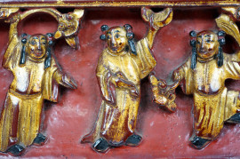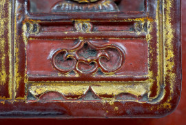 Pannello cinese in legno intagliato, laccato e dorato, XX secolo, cm 14,5x29,5