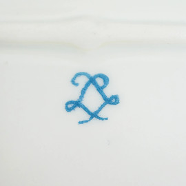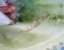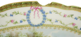 Piatto ovale in porcellana policroma con scena neoclassica, bordo decorato con ghirlande e swag con fiori blu e rosa, marchio sul retro, Francia, inizio XX secolo, cm 31,3x21 (difetti)