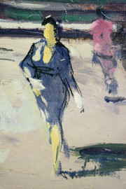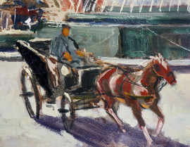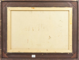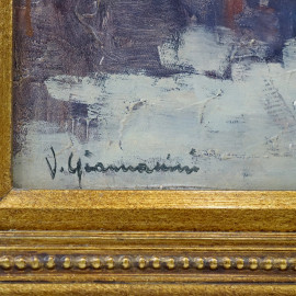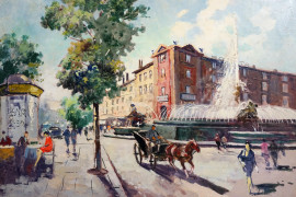 Piazza con fontana, olio su tela, cm 69x100, firmato, entro cornice