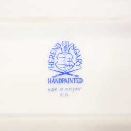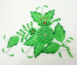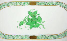 Piccolo vassoio in porcellana di Herend, XX secolo, con decori vegetali verdi e finiture dorate, cm 23x11,9