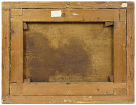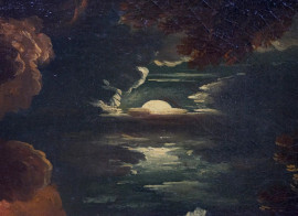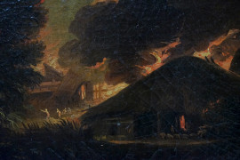 Pieter Mulier (Haarlem, 1637 - Milano, 1701), Paesaggio fluviale con incendio, olio su tela, cm 39,5x53,5, entro cornice