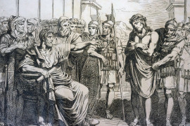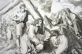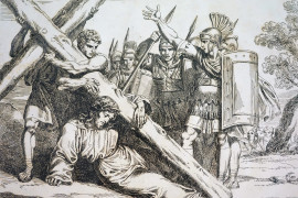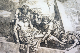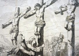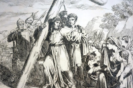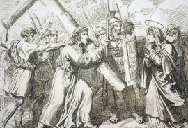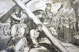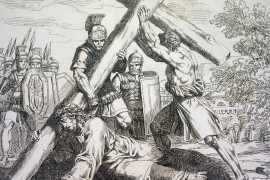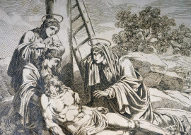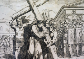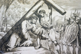 Lotto di 15 tavole raffiguranti le tappe della Via Crucis, incisioni, cm 36,5x43, entro passpartout, (macchie)