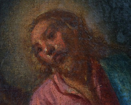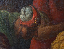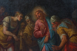 Pittore del XVII-XVIII secolo, Cristo e l'adultera, olio su tela, cm 64x94, entro cornice