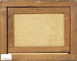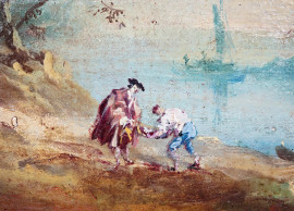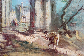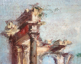 Pittore Veneziano del XIX-XX secolo, Veduta marina con capriccio architettonico e figure, olio su tela, cm 25x34,5, entro cornice