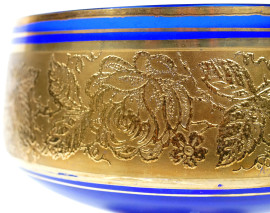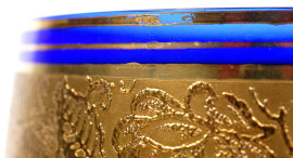 Portafrutta in cristallo con fascia dorata decorata a rilievo a motivi vegetali, Boemia, XX secolo, h cm 17