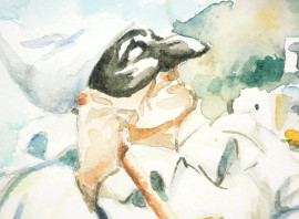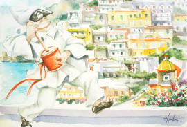 Pulcinella, acquerello su carta, XX secolo, firmato in basso a destra, cm 27x38,5 circa, entro cornice