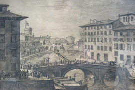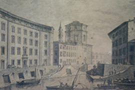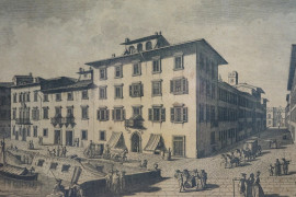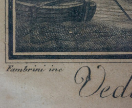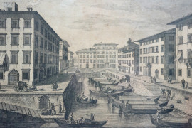 Quattro incisioni raffiguranti vedute di Livorno, cm 28x39, incisore Bartolomeo Nerici (c. 1708, Crasciana, Bagni di Lucca – c. 1798, Lucca) presso Aliprandi Giacomo (Bassano, 1775 - Venezia, 1855), entro cornici, (difetti sulla carta)