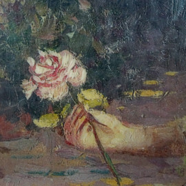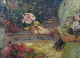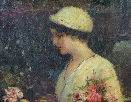 Ragazza con i fiori, olio su tela riportato su tavola, inizi XX secolo, cm 24x19, entro cornice