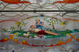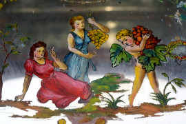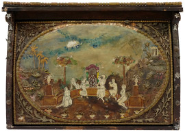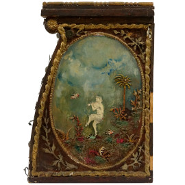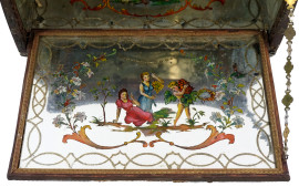 piano di linea sagomata con intarsi in metallo dorato e profilo scolpito a fusaiola. Fronte bombato a ribalta decorata da medaglione ovale raffigurante baccanale, fianchi laterali raffiguranti rispettivamente sul lato destro un fauno con il flauto e Venere con lo specchio. Interno a specchi decorati da scena di vendemmia, Diana ed Endimione, galli e pulcini, laterali a grottesche.