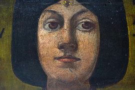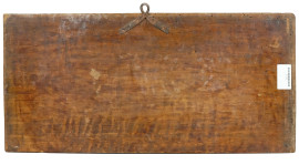 Ritratto di coniugi, sovrapporta ad olio su tavola, cm 33x69, inzi XX secolo, (cadute di colore)