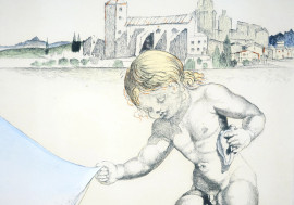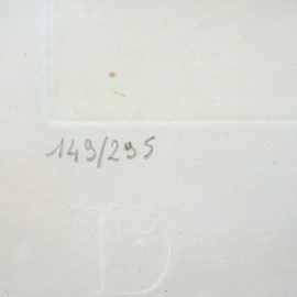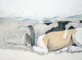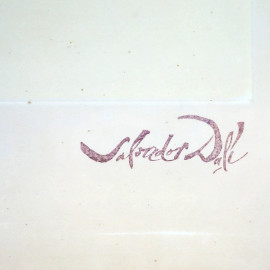 Salvador Dalì (1904-1989), Moi-meme à l'age de six ans, soulevant avec une extreme précaution la peau de la mer pour observer un chien dormant à l'ombre de l'eau, ed. 149/295, 1988, acquaforte, cm 58x80, entro cornice