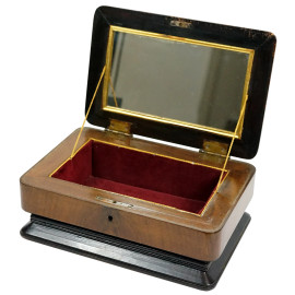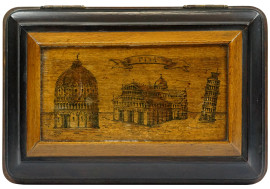 Scatola portagioie impillacciata in varie essenze, coperchio con riserva raffigurante Piazza dei Miracoli Pisa, interno rivestito in velluto, cm 13x27,5x18, (lievi difetti)