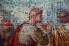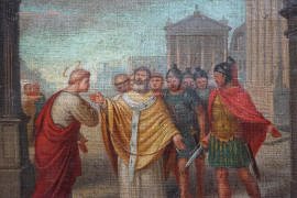 Scena con santi e soldati romani, olio su tela, XIX secolo, cm 25,5x31 (difetti)