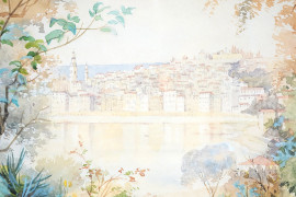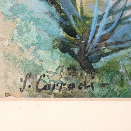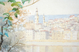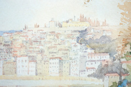Scorcio di città sul lago, acquerello su carta, cm 17x24, entro cornice