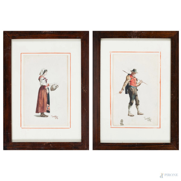 Scorcio di paese con figure, olio su tavoletta, firmato in basso a destra, cm 34,5x18, entro cornice